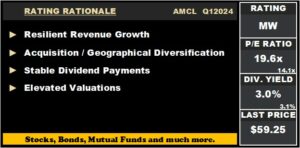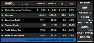 AMCL’s continues to strengthen and boost the value of its existing operations via strategic partnerships and acquisitions, while concurrently diversifying its presence regionally and internationally. On the basis of increased revenue growth, continued acquisition activity/ geographical diversification but tempered by elevated valuations, Bourse maintains a MARKETWEIGHT rating on AMCL.