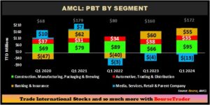 AMCL’s Profit Before Tax (PBT) increased to $172M in Q12024 relative to $160M in Q12023. Construction, Manufacturing, Packaging & Brewing the largest contributor to PBT (55.0%) climbed from $66M in Q12023 to $95M in Q12024, boosted by higher sales and increased operational efficiencies particularly in the Beverage sector. Banking and Insurance Services, the second largest contributor to PBT (31.9%) contracted 8.5% year-on-year to $55M. Automotive, Trading & Distribution (20.4% of PBT) reported a decline in profitability, down 5.8% to $35M relative to $38M in the prior comparable quarter. The Media, Services, Retail and Parent Company segment recorded a loss of $13M in Q12024, higher than the $4M loss reported in the last reported quarter.