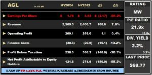 At a current price of $68.77, AGL trades at a Price to Earnings (P/E) Ratio of 21.9 times, above the Trading Sector average of 18.0 times. The stock offers a trailing dividend yield of 2.2%, below the sector average of 3.3%. The Group announced an interim dividend of $0.40 per share payable on June 28th, 2024, to shareholders registered by June 3rd, 2024, and closed on June 4th and 5th, 2024.