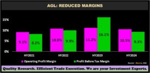AGL’s Operating and Profit Before Tax margins both declined, despite revenue growth in HY2024. Operating Profit Margin declined to 10.5% in HY2024 from 11.2% in HY2023. This filtered into Profit Before Tax Margin, which narrowed to 9.3% relative to 16.1% in the prior period. Excluding the one-off gain, PBT Margin would have been an estimated 10.2% in HY2023.