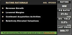 AGL continues to grow its segments through organic growth and, more significantly, via strategic acquisitions, allowing for more geographic variety within the Group. Integration of these acquisitions successfully and cost-effectively into the group should be an important driver of earning momentum in the coming quarters. On the basis of acquisition activities and revenue growth, tempered by narrower margins and relatively elevated valuations, Bourse maintains a MARKETWEIGHT rating on AGL.