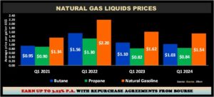 Average Butane prices dwindled 6.4% from US$1.10 per gallon in Q12023 to US$1.03 per gallon in Q12024, while average Propane prices gained 2.4% from US$0.82 per gallon to US$0.84 per gallon. Natural Gasoline declined 4.9% to US$1.54 per gallon in Q12024 from US$1.62 in the prior comparable period. Year to date, the weighted basket of NGLs has averaged US$1.20 per gallon.