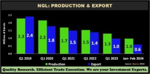 Production and exports of NGLs have continued on a generally downward trend based on available official data, notwithstanding PPGPL’s reported improved production in Q1 2024.