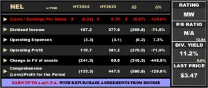NEL’s book value per share declined in HY2024, driven by a decline in the valuation of its investee companies. The Group’s Book Value Per Share (BVPS) fell from $7.10 in HY2023 to $5.01, down 29.5% in the most recent period. When combined with the fall in its stock price, NEL’s price to book ratio increased from 0.5 times in HY2023 to a current level of 0.7 times.