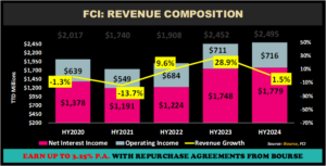 Total Revenue grew marginally Year on Year (YOY) by 1.8% to $2.50B from a prior TT$2.45B in HY2023. This positive effect on revenue, according to FCI, was as a result of greater net interest margin on the Group’s US dollar loan portfolio. Net Interest Income, the Group’s primary revenue source (71.3%), improved by 1.8% to TT$1.78B from TT$1.75B a year earlier. The Group’s loan portfolio grew marginally by 0.1% from TT$44.1B in HY2023 to TT$45.2B in the current review period. Operating Income (accounted for 28.7% of Total Revenue) expanded marginally by 0.8%, from TT$711M to TT$716M. Despite economic activity nearing pre-COVID levels across most of the region, the major driver of FCI’s fortunes continues to be elevated interest rates. Persistent USD rates should be supportive to earnings momentum in the near-term.