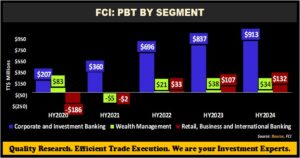 FCI’s Profit Before Tax (PBT) expanded by 11% Year over Year (YoY). The Bank’s largest contributor to PBT growth, Corporate and Investment Banking (84.6% of PBT), advanced 9.2% from TT$837M to TT$913M. Personal & Business Banking (PBB) contributed 12.2% to PBT, resulted in 23.8% improvement year on year from TT$107M in HY2023 versus TT$132M in the current review period. The Wealth Management (WM) segment (3.1% of PBT) was 10.9% lower, from TT$38M in HY2023 relative to TT$34M in HY2024.