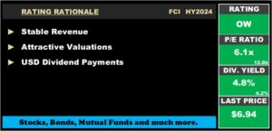FCI’s profitability should remain resilient in the current rate environment, bolstered by the Group’s positive economic growth outlook for moderate levels of economic activity across the region. On the basis of revenue growth, attractive P/E multiples and USD dividends, Bourse maintains an OVERWEIGHT rating on FCI.
