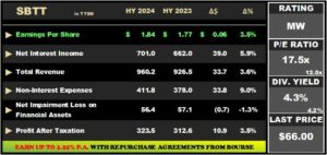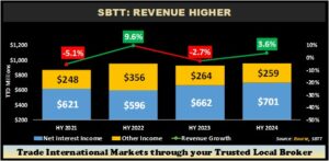 SBTT is currently priced at $66.00 and trades at a Trailing Price to Earnings ratio of 17.5 times, above the Banking Sector average of 12.0 times. The stock offers investors a healthy Trailing Dividend Yield of 4.3%, above the sector average of 4.2%. The Group declared a final dividend payment of $0.70 per share to be paid on July 15th, 2024, and to be registered by June 24th, 2024.