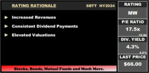 SBTT’s steady dividend payments remain an appealing value proposition for stock ownership, even as other banking sector stocks offer comparable and/or superior dividend yields. On the basis of improved performance and consistent dividend payments but tempered by elevated sector valuations, Bourse maintains a MARKETWEIGHT rating on SBTT.