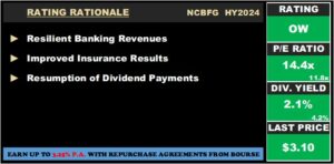 The Group’s recent recovery in financial performance will come as welcome news for investors. NCBFG’s recently concluded APO and assets sales, likely aimed at optimizing its capital structure, should be supportive of greater earnings stability in subsequent periods. On the basis of (i) earnings growth, (ii) the resumption of dividend payments to shareholders and (iii) relatively attractive P/B valuations, Bourse maintains an OVERWEIGHT rating on NCBFG.