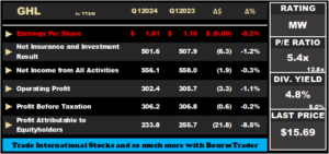 GHL is currently priced at $15.69 and trades at a price to earnings ratio of 5.4 times, below the Non-Banking Financial Sector average of 12.8 times. The stock currently offers investors a trailing dividend yield of 4.8% compared to a sector average of 5.0%. On the basis of improved insurance revenue, relatively attractive valuations but tempered by lower earnings and higher financing expenses, Bourse maintains a MARKETWEIGHT rating on GHL.
