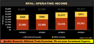 RFHL reported a Diluted Earnings Per Share (EPS) of $6.13 for the six months ended 31st March 2024 (HY2024), a 27.4% increase when compared to the EPS of $4.81 recorded in the previous comparable period. Net Interest Income grew 10.9% to $2.50B from the previous $2.26B, on account of increase credit advances. Other Income fell 9.8% and stood at $971M in HY2024, relative to $1.08B in HY2023. Consequently, Operating Income increased to $3.47B, an improvement of 4.2%. Operating Expenses grew by 3% from $1.82B in HY2023 to $1.88B in HY2024. Resultantly, RFHL’s Operating Profit for the period amounted to $1.60B relative to $1.51B in HY2023, up 5.7%. Credit Loss Expense decreased 62.4% from $306M in HY2023 to $115M in HY2024. Profit Before Taxation (PBT) climbed to $1.46B in HY2024, 20.8% higher than $1.21B in the previous fiscal year (HY2023). Taxation Expense was 4.4% lower, with the effective taxation rate moving from 28% in HY2023 to 22% in HY2024. Overall, RFHL’s Net Profit attributable to Equity Holders amounted to $1.0B, 27.3% higher than $178M reported in the prior comparable period.
