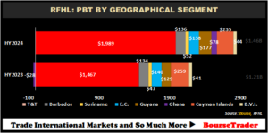 RFHL’s PBT expanded in seven out of its eight major operating jurisdictions in the six months ending March 31st, 2024, up 20.8% year-on-year (including eliminations and other Adjustments). Trinidad and Tobago, the Group’s largest operating jurisdiction expanded 35.6% YoY to $1.99B from $1.47B in the previous comparable period. Guyana recorded an increase of 37.2% from $129M to $177M. Suriname climbed 10.6% year-on-year, moving from $47M to $52M in the current reporting period. British Virgin Islands (BVI) gained 7.3% YoY to $44M (HY2024).