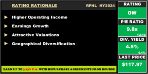 RFHL’s combination of earnings, dividends, and current price continue to offer relatively compelling value proposition for investors from both a capital growth and income perspective. On the basis of geographical diversification of operations, improved earnings and attractive valuations, Bourse maintains an OVERWEIGHT rating on RFHL.