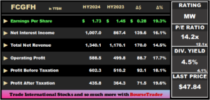 FCGFH is currently priced at $47.84 trades at a P/E ratio of 14.2 times, above the Banking Sector average of 12.1 times. The Group declared an interim dividend payment of $0.47 per share, to be paid to shareholders on 29th May 2024. The stock offers a dividend yield of 4.5%, above the Banking sector average of 4.1%.